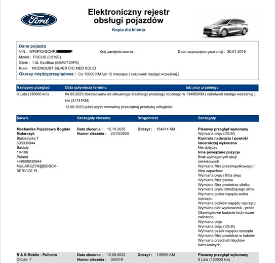 - Przegląd musi być wykonany w autoryzowanym serwisie (ASO) lub w serwisie specjalistycznym BOSCH CAR SERVICE BOGDAN MULARCZYK, aby zachować gwarancję fabryczną.